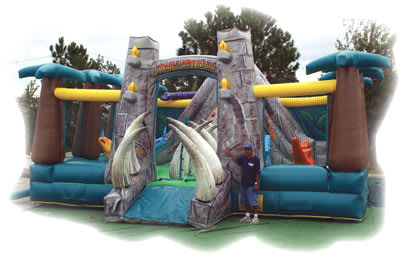 Our Jurassic Adventure is the ultimate ride for an action packed adventure. Up to 25 children at a time can play in this gigantic prehistoric size inflatable. This ride features a Saber Tooth Tiger tooth crawl, two different obstacle areas, 2 different bouncer areas, a monster rock climb and two slides. The Jurassic Adventure will tame even the largest Of T-Rexes.