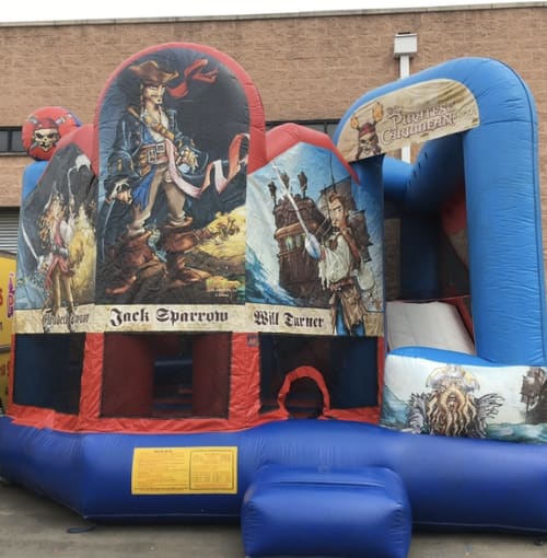 Our Pirate Bounce Combo is filled with a large bouncing area, pop ups to go thru, climbing wall and a slide to finish the fun. What better way to have party!!!