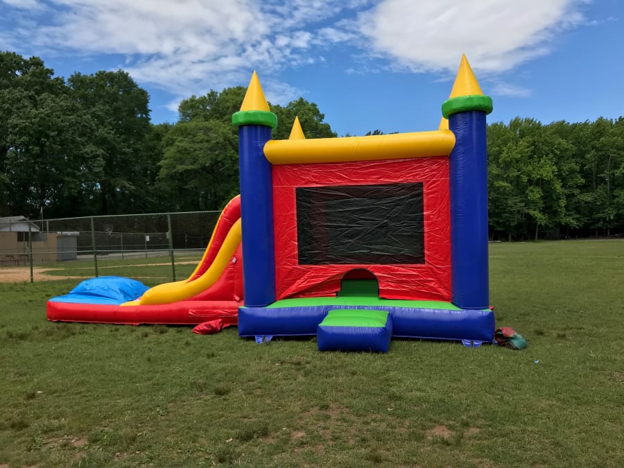 This Castle Combo unit can be used Wet or Dry. Has a big bouncing area and a climbing wall that leads to the slide and also a Basketball hoop inside!!