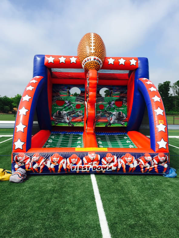 The First and Down from Party Jam is an exciting inflatable game that lets players young and old show off their passing game. Future Quarterbacks can face off with each other as they throw the football across the field to the back wall that holds a line of receivers. Once the pass is completed, the football then is returned to the opposing quarterbacks lane . First one to complete there passes WINS!!