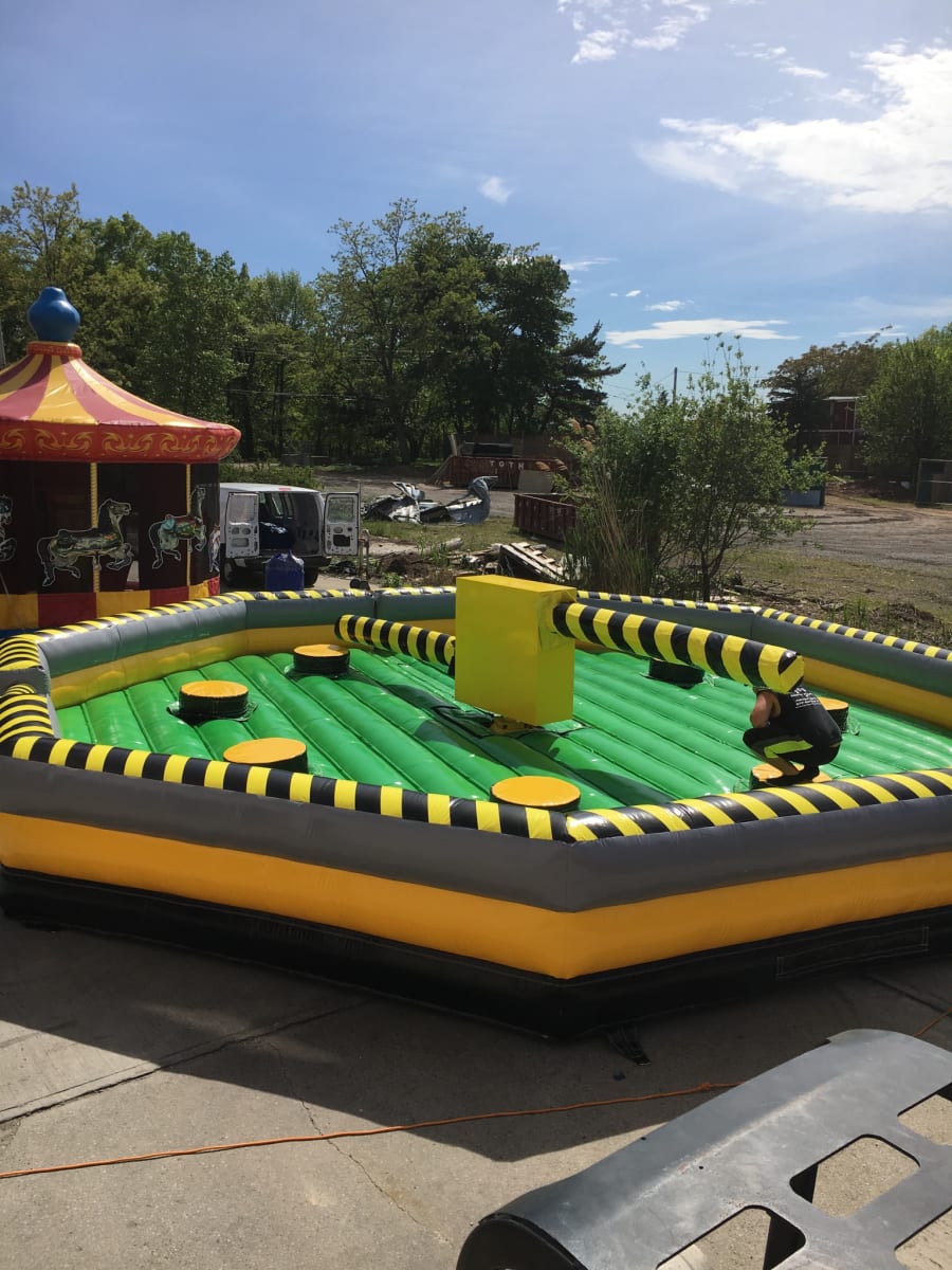 Not one but two spinning boom arms try to knock you off your podium. You have to duck underneath or jump over the foam boom. Who will be the last one standing?